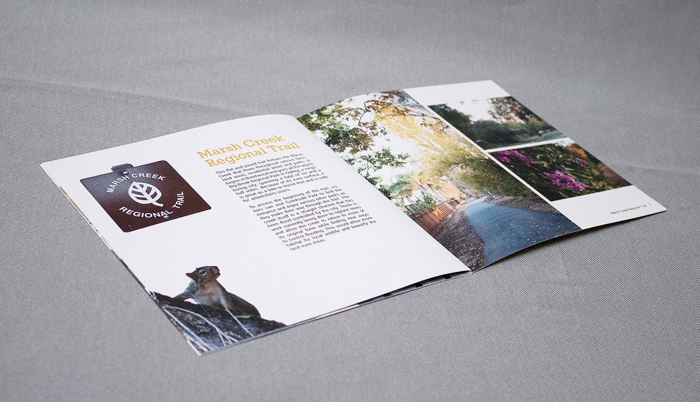 This booklet is an informational guide for parks and green spaces in Brentwood, California created for the travel company, Travelcation. Including all original photography and written copy featuring three different spaces, this is a fully functional guidebook for visitors of the city.